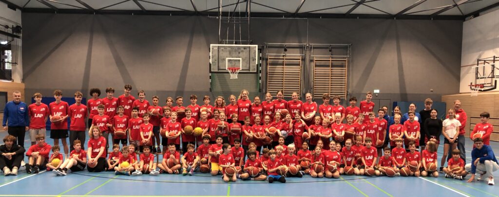 Zum 10. Mal heißt es in Lüneburg drei Tage lang „Basketball, Basketball, Basketball“. Das Basketballcamp der 66ers für SpielerInnen der U14 und jünger ist inzwischen ein fester Termin in den Herbst- und Osterferien! Mit 90 TeilnehmerInnen und 19 Coaches hat das Camp heute am 22.10.25 gestartet. Zum Jubiläum gab es dieses Mal für jede/n ein Shootingshirt im neuen Design.